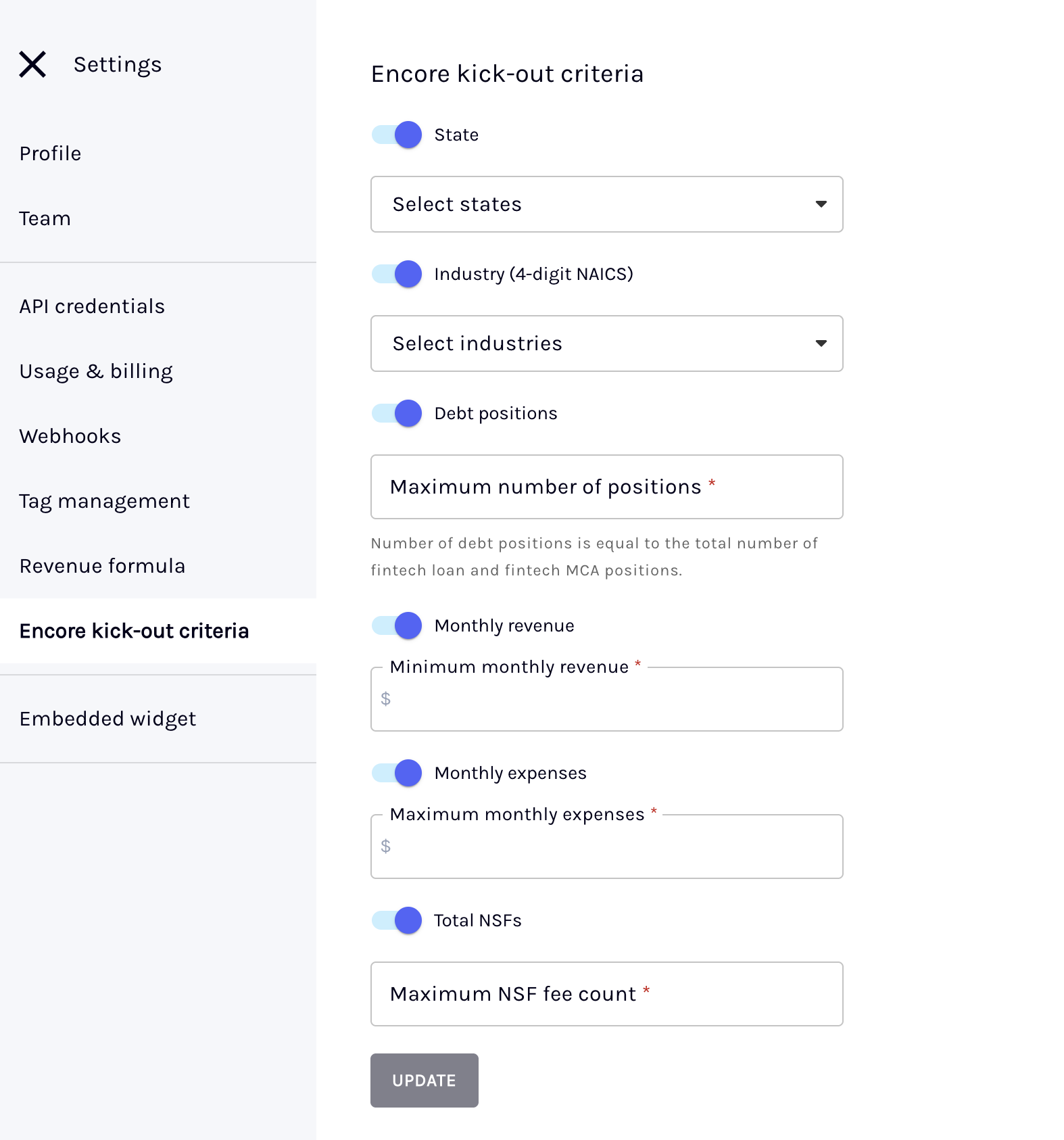 As part of ongoing enhancements to the Encore recipient workflow, we've introduced automated cash flow kick-outs to enable recipient organizations automatically accept or reject incoming shared Books based on funder-defined cash flow criteria. Recipients can define and manage kick-out rules using key fields such as industry, state, revenue, expenses, fintech debt count and NSFs, allowing incoming Books to be evaluated automatically at scale.