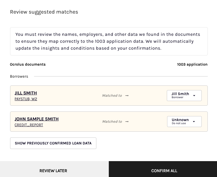 If Ocrolus cannot automatically match names from documents to those in Encompass, you will see a manual mapping screen. This feature helps you connect individuals with the correct borrowers easily.