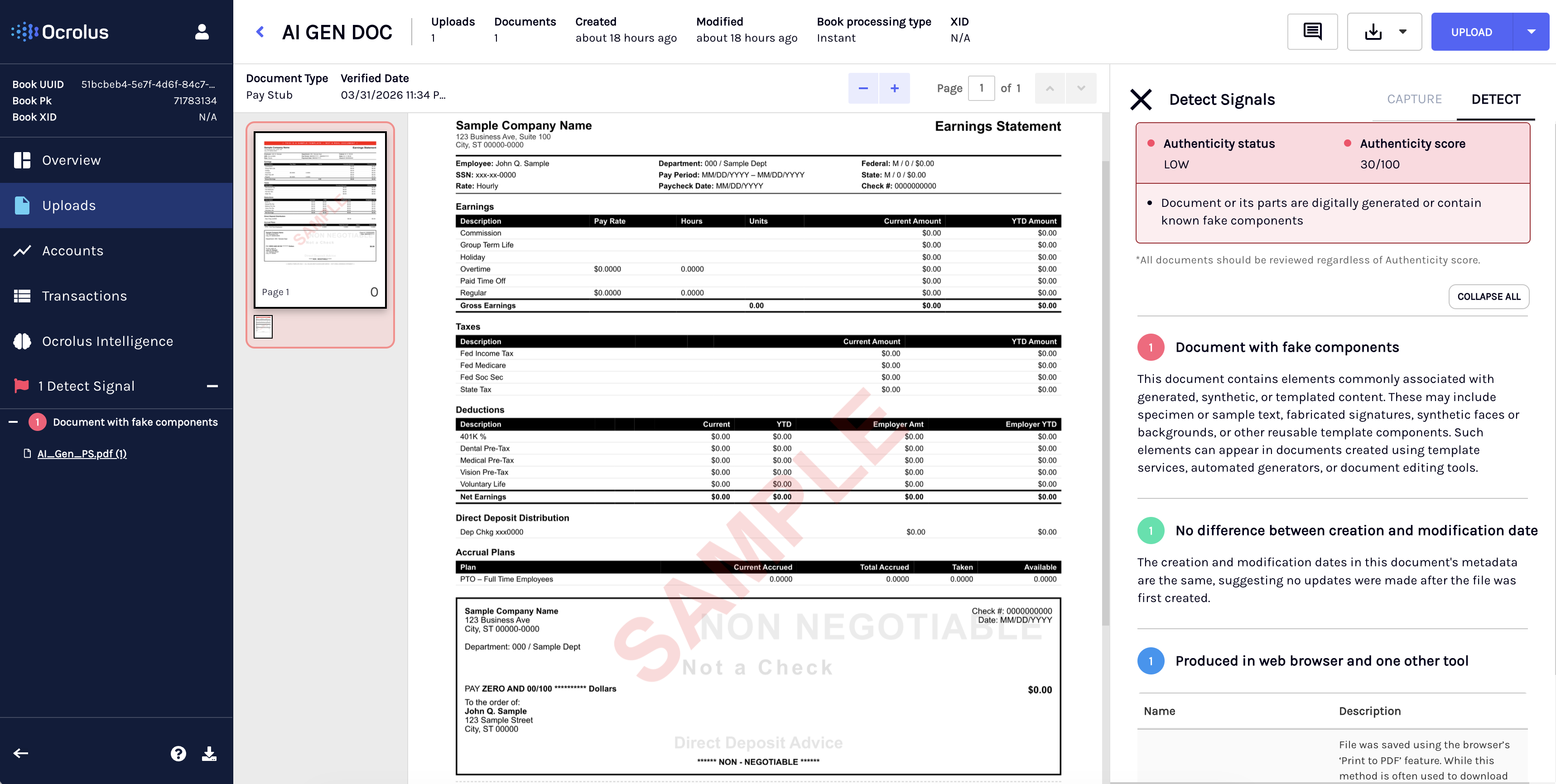 The Authenticity Status results are available in both the Ocrolus Dashboard and API responses. To learn more see, Visualisation section.