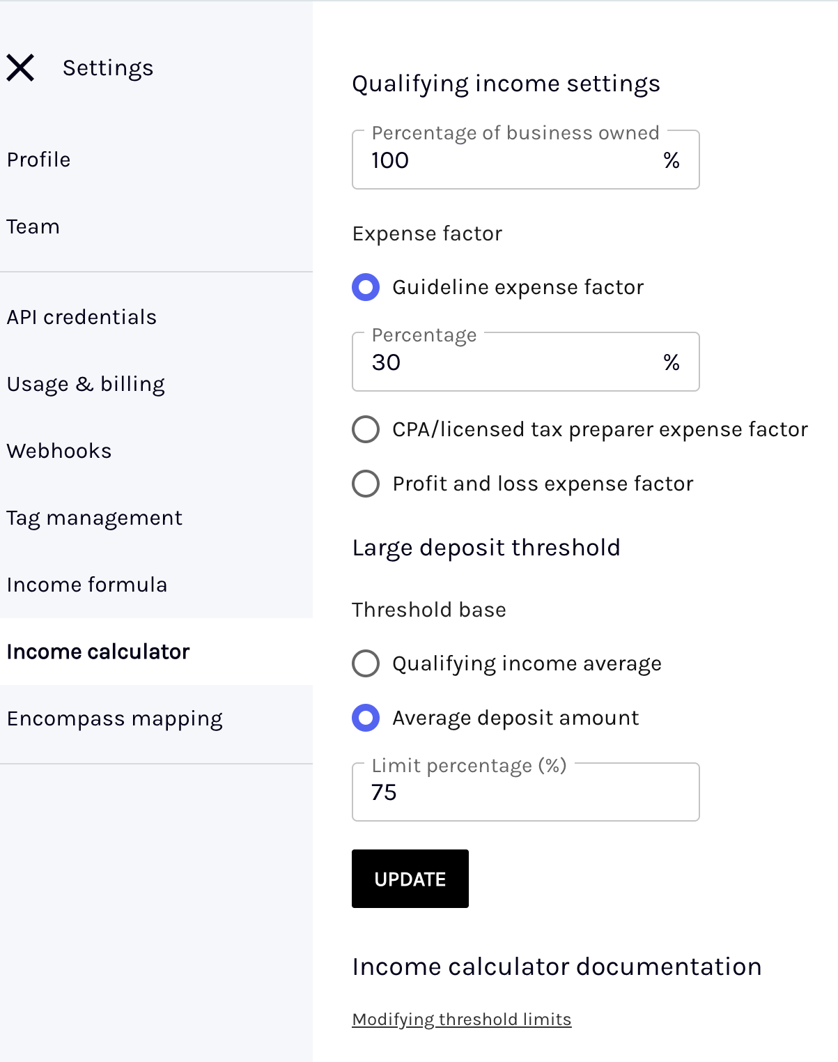 - Expense Factor: You need to manually select an expense factor to be used for the qualifying income calculation, such as Standard, CPA/ Licensed Tax Preparer, and Profit and Loss.
