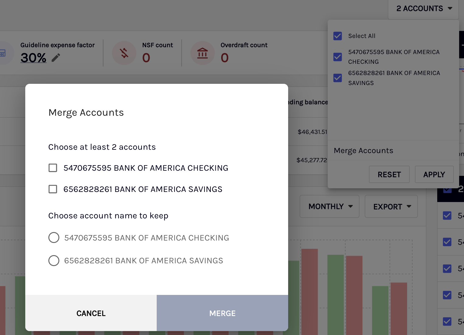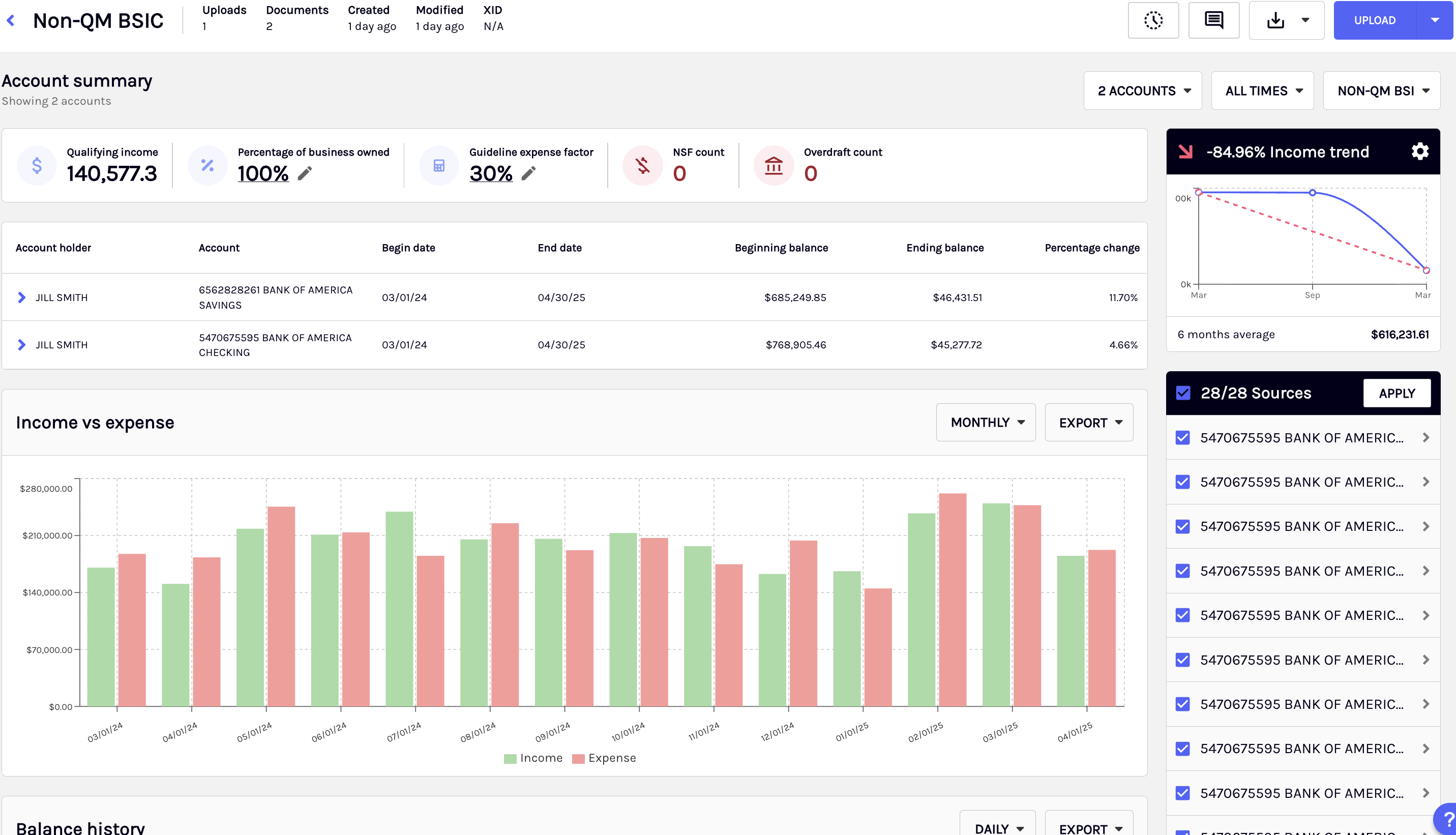 When you receive statements that logically belong together, for example, multiple accounts for the same business, you can merge them in BSIC to generate a unified income analysis. This helps you view consolidated income trends and eliminates the need to analyze related accounts separately.