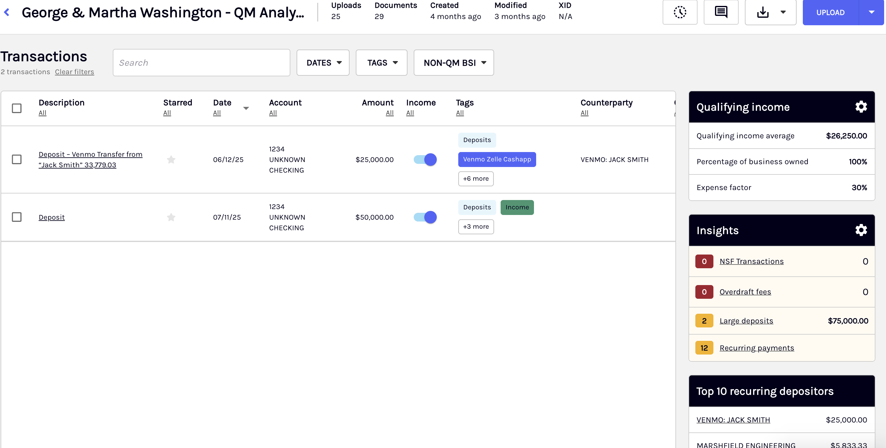 This tab highlights the top 10 recurring depositors, making it easier to identify consistent income sources, and displays large deposit threshold values for each month, ensuring visibility into significant transactions. A key enhancement to the statement overview table is the Declining Income Indicator, which helps you quickly spot downward trends in income, allowing for more informed decision-making.