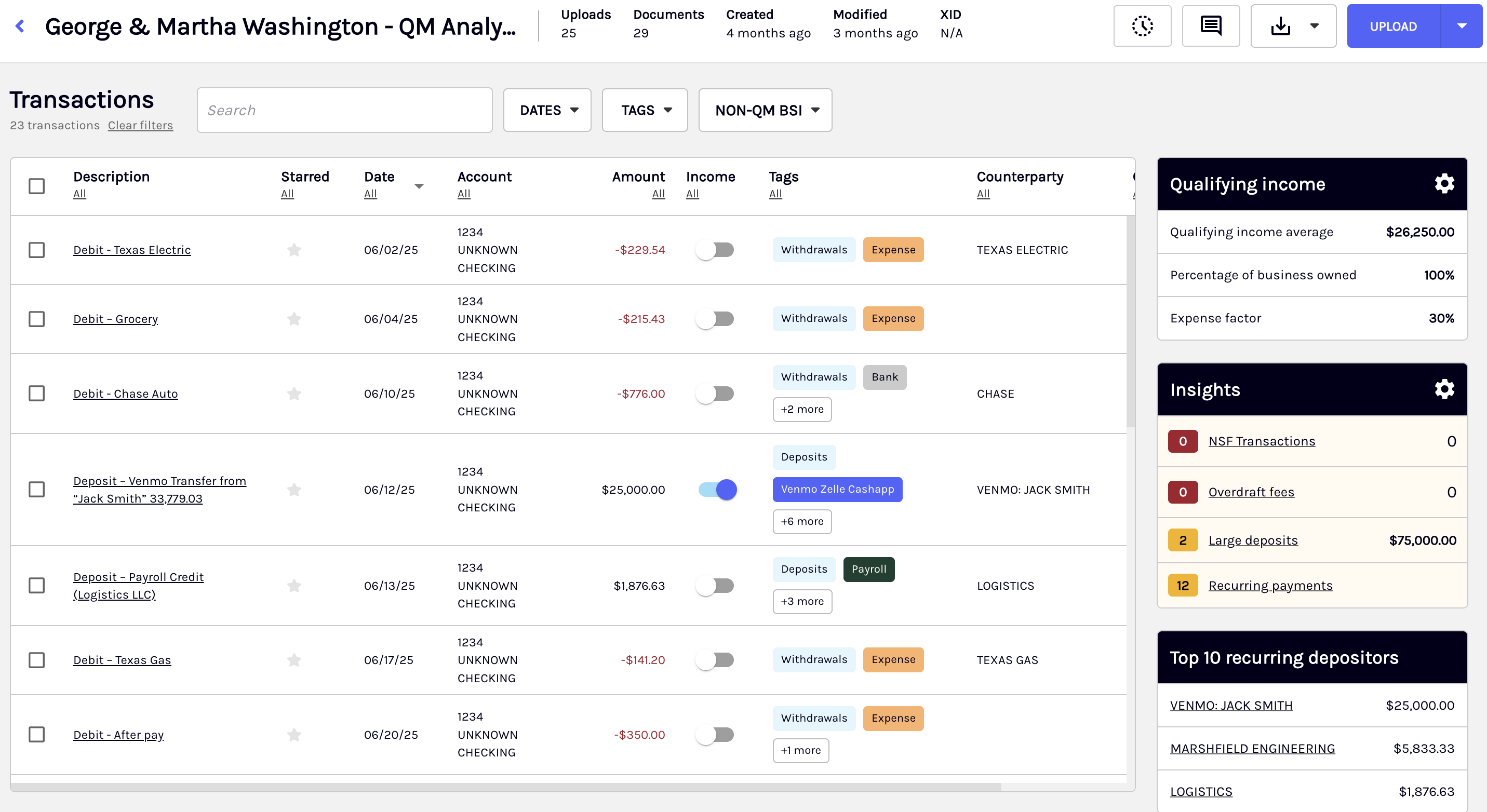 The Account Summary tab provides a detailed breakdown of a bank account’s financial data to offer deeper insights beyond the high-level overview in the Book Summary tab. Review all deposit transactions, examine statement overview details, and analyze key financial patterns to better understand income trends.