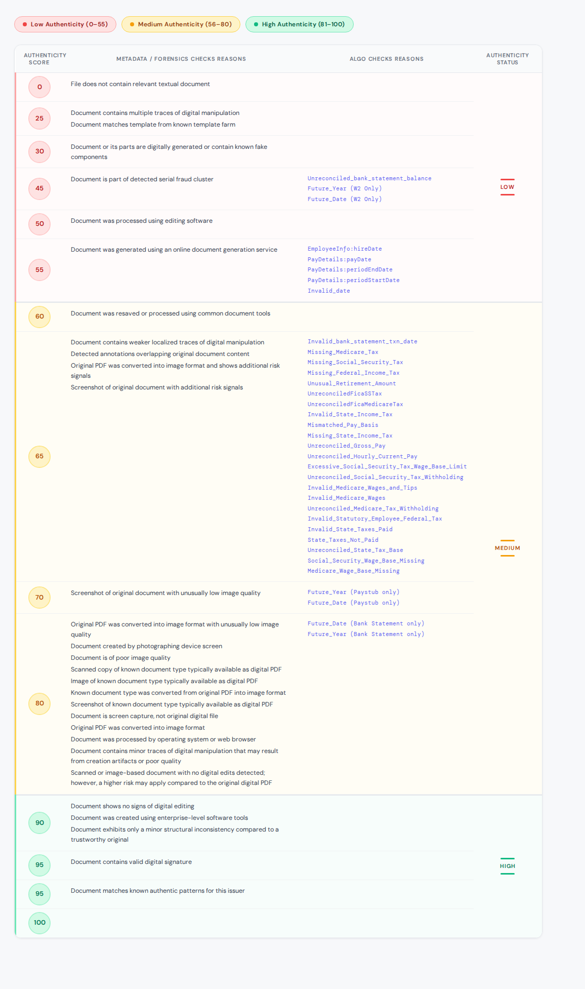 The Authenticity Status merges signals from both sources using a highest-risk-wins decision rule. This ensures fraud-sensitive signals always take precedence. The combined verdict is surfaced as a single Authenticity Status: LOW, MEDIUM, or HIGH in Ternary mode, or LOW / HIGH in Binary mode accompanied by structured reason codes, enabling fraud analysts and underwriters to understand exactly which layer flagged a document and why.