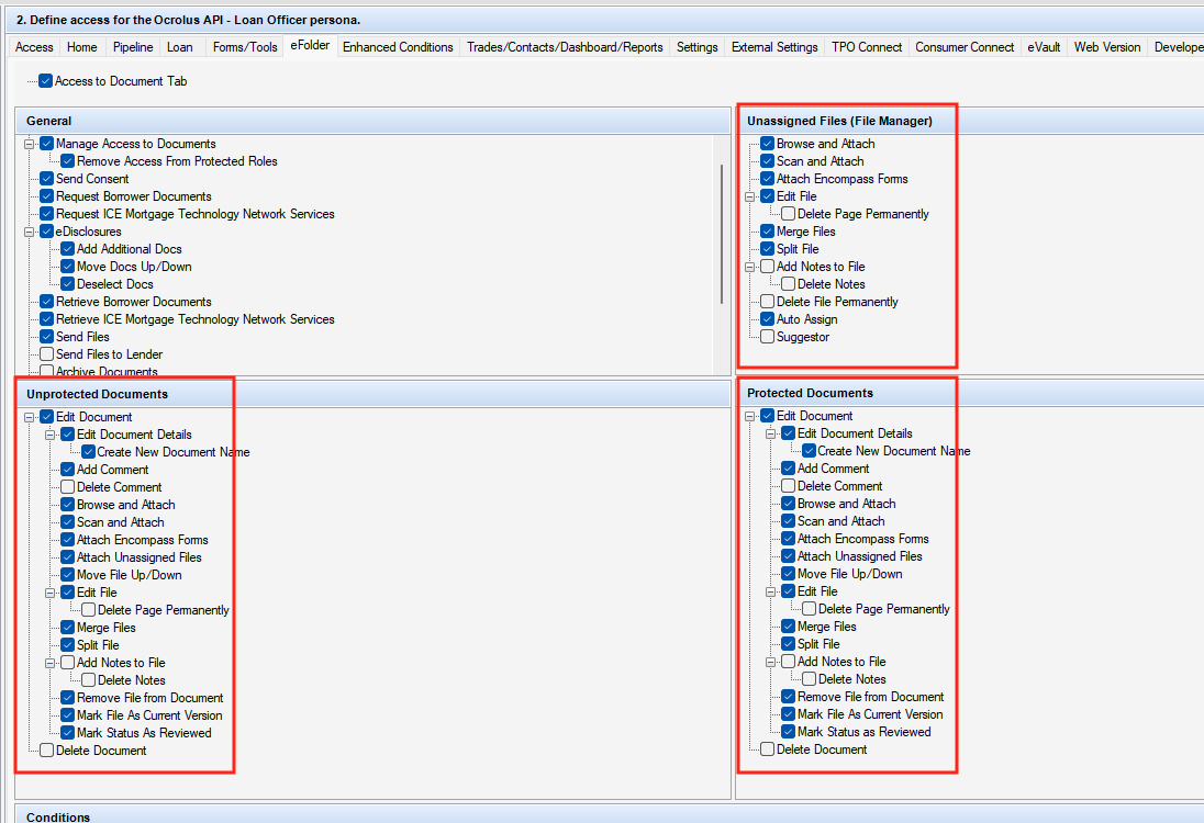 You'll need to configure your new Ocrolus persona with access to your eFolder and the document management controls. Select the eFolder tab and adjust the settings as follows: