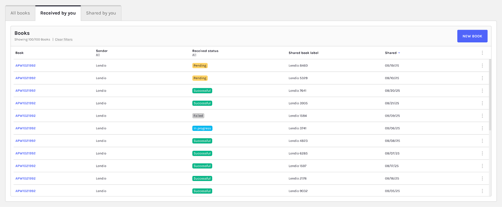 In Phase 2 (coming soon), receivers will have the option to accept or reject shared Books after previewing cash flow data. Until then, Books will move quickly from Pending or In progress to a final Success state. In rare cases, a Book may enter the Failed state due to transfer or processing errors.